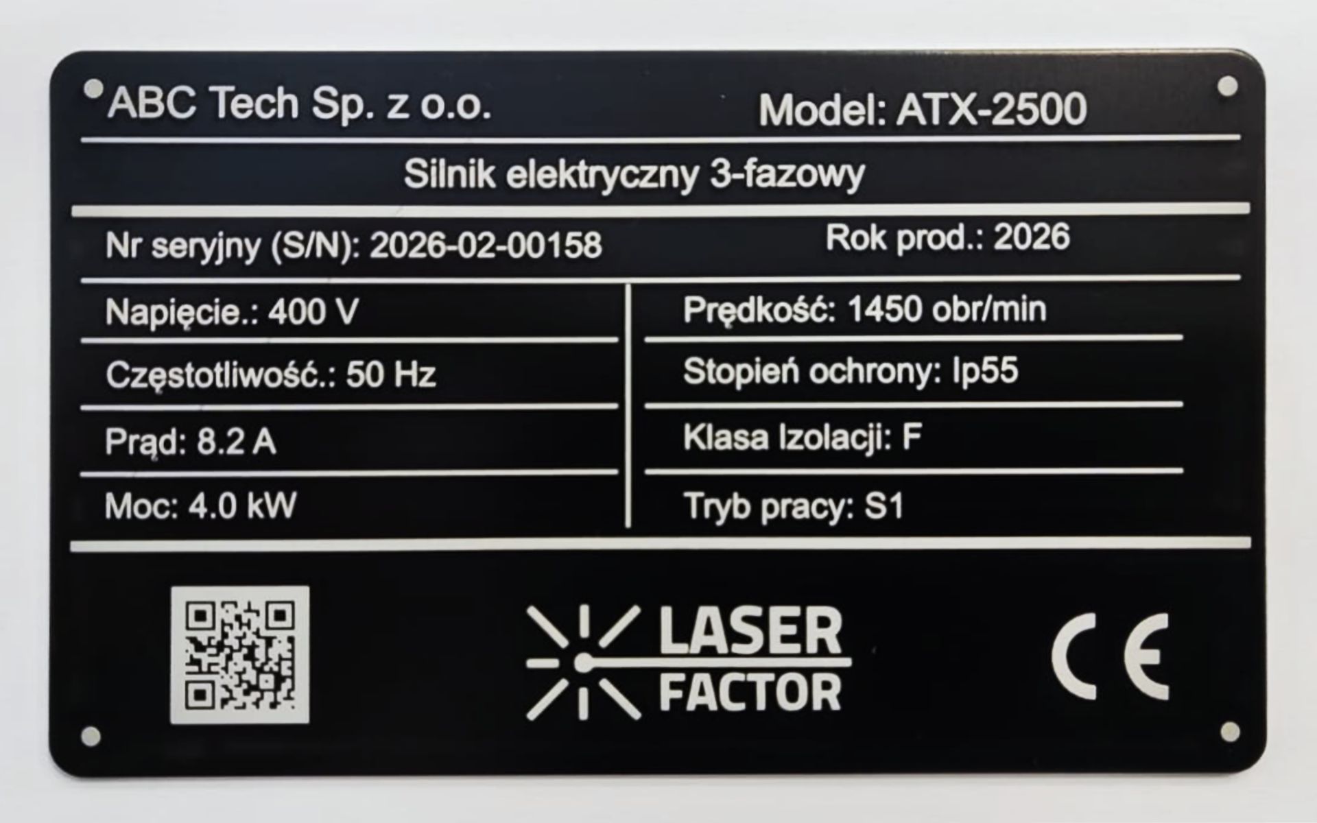 Precyzyjne grawerowanie tabliczek znamionowych, opisów technicznych i oznaczeń CE. Czytelny efekt nawet przy drobnym tekście i małych elementach.